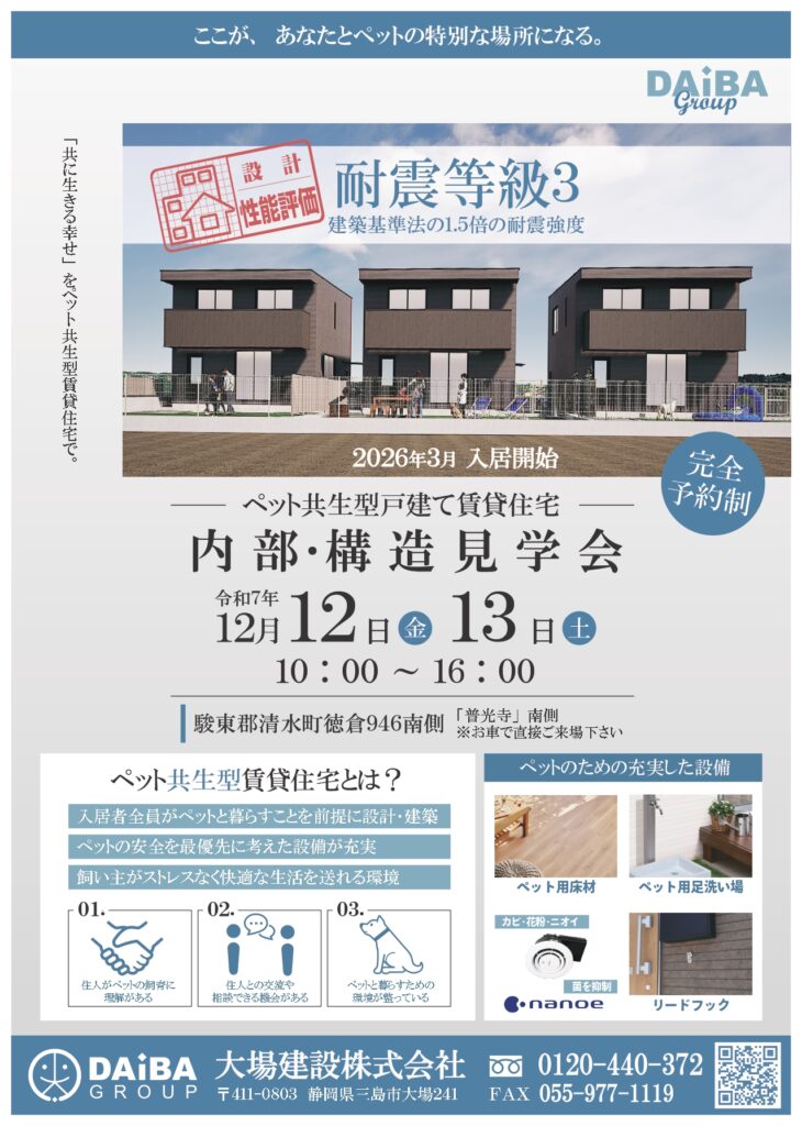ペット共生型戸建て賃貸住宅の内部・構造見学会を開催いたします。